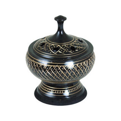 Say goodbye to basic burners with this Black Brass Engraved Burner. This elegant black burner has beautiful golden crisscrossed engravings on the lid and the body for a stunning decorative touch. The removable lid has small holes distanced equally around it for smoke to escape, with a narrow handle in the center. It is perfect for burning charcoal, resin, and incense cones with an elegant style. It makes a lovely, regal addition to home décor. A wooden coaster is included. Beautify your home today with this brass engraved burner.